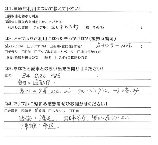 お車のご相談・ 査定だけでもOK! カンタン 入力 30秒 アップルがブランド買取始めました! お電話でも受付中! 受付時間10:00 ~ 18:30 0120-174-177 お車のご相談・ 査定だけでもOK! カンタン 入力 30秒 アップルがブランド買取始めました! お電話でも受付中! 受付時間10:00 ~ 18:30 0120-174-177 アップルがブランド買取始めました! お電話でも受付中! 受付時間10:00 ~ 18:30 0120-174-177 店舗情報 在庫車 スタッフ紹介 ブログ お客様の声 キャンペーン お得 無料査定 click お客様の声 ご記入日: 2016/05/12 N様 接客:満足 四日市本店、皆さん感じがよい下車額:普通 前へ 次へ お客様の声一覧を見る