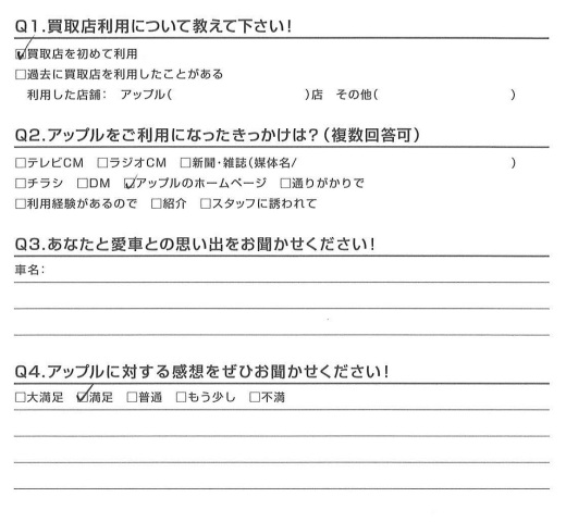 お車のご相談・ 査定だけでもOK! カンタン 入力 30秒 アップルがブランド買取始めました! お電話でも受付中! 受付時間10:00 ~ 18:30 0120-174-177 お車のご相談・ 査定だけでもOK! カンタン 入力 30秒 アップルがブランド買取始めました! お電話でも受付中! 受付時間10:00 ~ 18:30 0120-174-177 アップルがブランド買取始めました! お電話でも受付中! 受付時間10:00 ~ 18:30 0120-174-177 店舗情報 在庫車 スタッフ紹介 ブログ お客様の声 キャンペーン お得 無料査定 click お客様の声 ご記入日: 2016/06/17 U様 担当:松嶋 前へ 次へ お客様の声一覧を見る