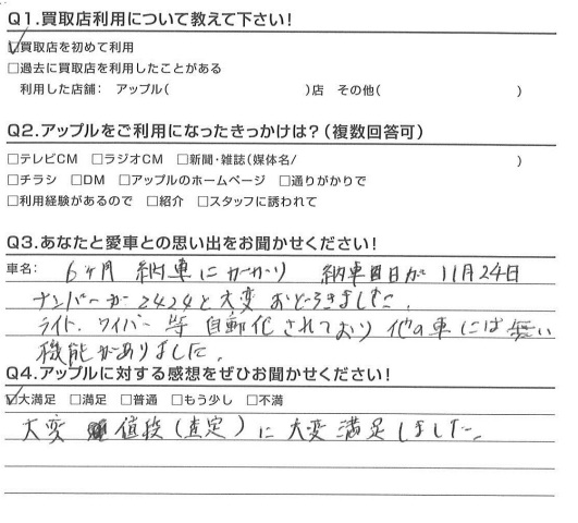 お車のご相談・ 査定だけでもOK! カンタン 入力 30秒 アップルがブランド買取始めました! お電話でも受付中! 受付時間10:00 ~ 18:30 0120-174-177 お車のご相談・ 査定だけでもOK! カンタン 入力 30秒 アップルがブランド買取始めました! お電話でも受付中! 受付時間10:00 ~ 18:30 0120-174-177 アップルがブランド買取始めました! お電話でも受付中! 受付時間10:00 ~ 18:30 0120-174-177 店舗情報 在庫車 スタッフ紹介 ブログ お客様の声 キャンペーン お得 無料査定 click お客様の声 ご記入日: 2016/07/02 M様 大変値段(査定)に大変満足しました。担当:鈴木 前へ 次へ お客様の声一覧を見る