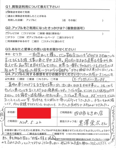 義母の車(VOXY)を引き受ける事になり、泣く泣くセリカを手放すことに。でもいくらキレイの乗っていても古くてATでは廃車扱いです。アップルも含め、どこでも大して値段は付きません。でも露骨に迷惑顔の他社と違い、アップルの黒澤さんは、まずセリカをどんなに気に入っていたのか等、気持ちをすごく酌んで優しく対応をして下さいました。本当にそれが嬉しくて、内心未練タラタラだったセリカにも、スッキリした気持ちでお別れができました。