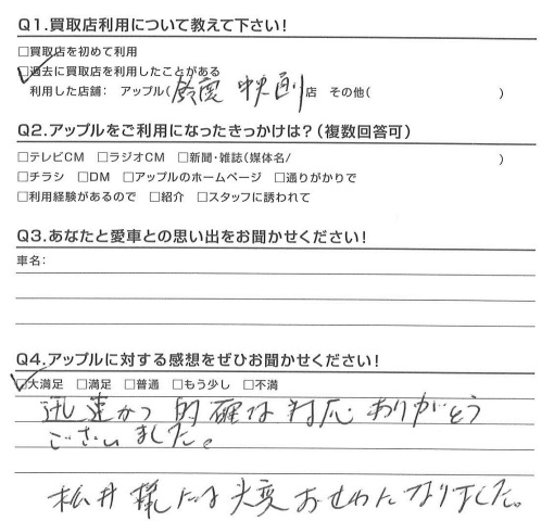 お車のご相談・ 査定だけでもOK! カンタン 入力 30秒 アップルがブランド買取始めました! お電話でも受付中! 受付時間10:00 ~ 18:30 0120-174-177 お車のご相談・ 査定だけでもOK! カンタン 入力 30秒 アップルがブランド買取始めました! お電話でも受付中! 受付時間10:00 ~ 18:30 0120-174-177 アップルがブランド買取始めました! お電話でも受付中! 受付時間10:00 ~ 18:30 0120-174-177 店舗情報 在庫車 スタッフ紹介 ブログ お客様の声 キャンペーン お得 無料査定 click お客様の声 ご記入日: 2016/07/03 N様 迅速かつ的確な対応ありがとうございました。松井様には大変おせわになりました。担当:松井 前へ 次へ お客様の声一覧を見る