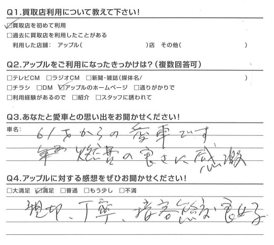 お車のご相談・ 査定だけでもOK! カンタン 入力 30秒 アップルがブランド買取始めました! お電話でも受付中! 受付時間10:00 ~ 18:30 0120-174-177 お車のご相談・ 査定だけでもOK! カンタン 入力 30秒 アップルがブランド買取始めました! お電話でも受付中! 受付時間10:00 ~ 18:30 0120-174-177 アップルがブランド買取始めました! お電話でも受付中! 受付時間10:00 ~ 18:30 0120-174-177 店舗情報 在庫車 スタッフ紹介 ブログ お客様の声 キャンペーン お得 無料査定 click お客様の声 ご記入日: 2016/06/25 E様 親切、丁寧、接客態度良好担当:松井 前へ 次へ お客様の声一覧を見る