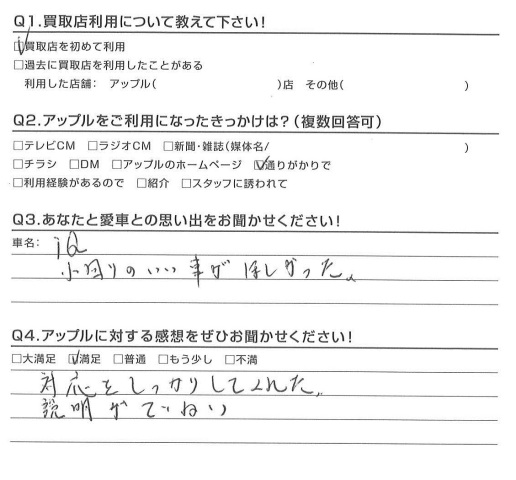 お車のご相談・ 査定だけでもOK! カンタン 入力 30秒 アップルがブランド買取始めました! お電話でも受付中! 受付時間10:00 ~ 18:30 0120-174-177 お車のご相談・ 査定だけでもOK! カンタン 入力 30秒 アップルがブランド買取始めました! お電話でも受付中! 受付時間10:00 ~ 18:30 0120-174-177 アップルがブランド買取始めました! お電話でも受付中! 受付時間10:00 ~ 18:30 0120-174-177 店舗情報 在庫車 スタッフ紹介 ブログ お客様の声 キャンペーン お得 無料査定 click お客様の声 ご記入日: 2016/08/24 匿名希望様 対応をしっかりしてくれた。説明がていねい。担当:鈴木 前へ 次へ お客様の声一覧を見る