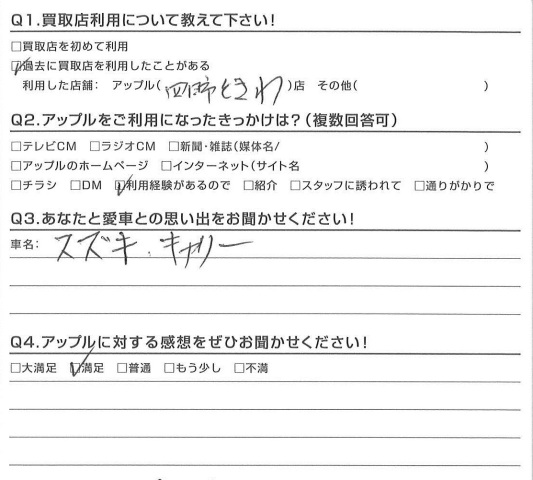 お車のご相談・ 査定だけでもOK! カンタン 入力 30秒 アップルがブランド買取始めました! お電話でも受付中! 受付時間10:00 ~ 18:30 0120-174-177 お車のご相談・ 査定だけでもOK! カンタン 入力 30秒 アップルがブランド買取始めました! お電話でも受付中! 受付時間10:00 ~ 18:30 0120-174-177 アップルがブランド買取始めました! お電話でも受付中! 受付時間10:00 ~ 18:30 0120-174-177 店舗情報 在庫車 スタッフ紹介 ブログ お客様の声 キャンペーン お得 無料査定 click お客様の声 ご記入日: 2016/09/23 K様 愛車:スズキ キャリー担当:野口 前へ 次へ お客様の声一覧を見る