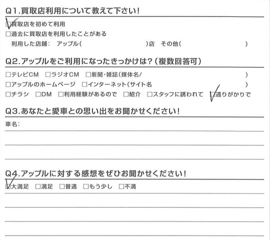 お車のご相談・ 査定だけでもOK! カンタン 入力 30秒 アップルがブランド買取始めました! お電話でも受付中! 受付時間10:00 ~ 18:30 0120-174-177 お車のご相談・ 査定だけでもOK! カンタン 入力 30秒 アップルがブランド買取始めました! お電話でも受付中! 受付時間10:00 ~ 18:30 0120-174-177 アップルがブランド買取始めました! お電話でも受付中! 受付時間10:00 ~ 18:30 0120-174-177 店舗情報 在庫車 スタッフ紹介 ブログ お客様の声 キャンペーン お得 無料査定 click お客様の声 ご記入日: 2016/10/07 N様 担当:野口 前へ 次へ お客様の声一覧を見る