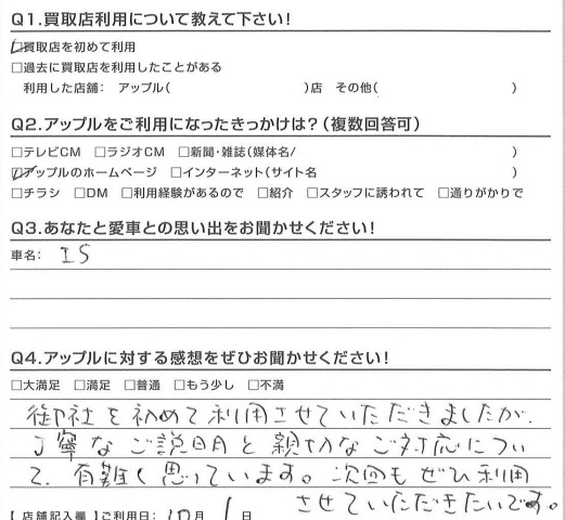 お車のご相談・ 査定だけでもOK! カンタン 入力 30秒 アップルがブランド買取始めました! お電話でも受付中! 受付時間10:00 ~ 18:30 0120-174-177 お車のご相談・ 査定だけでもOK! カンタン 入力 30秒 アップルがブランド買取始めました! お電話でも受付中! 受付時間10:00 ~ 18:30 0120-174-177 アップルがブランド買取始めました! お電話でも受付中! 受付時間10:00 ~ 18:30 0120-174-177 店舗情報 在庫車 スタッフ紹介 ブログ お客様の声 キャンペーン お得 無料査定 click お客様の声 ご記入日: 2016/10/01 O様 御社を初めて利用させて頂きましたが、丁寧なご説明と親切なご対応について、有難く思っています。次回も是非利用させて頂きたいです。担当:松井 前へ 次へ お客様の声一覧を見る