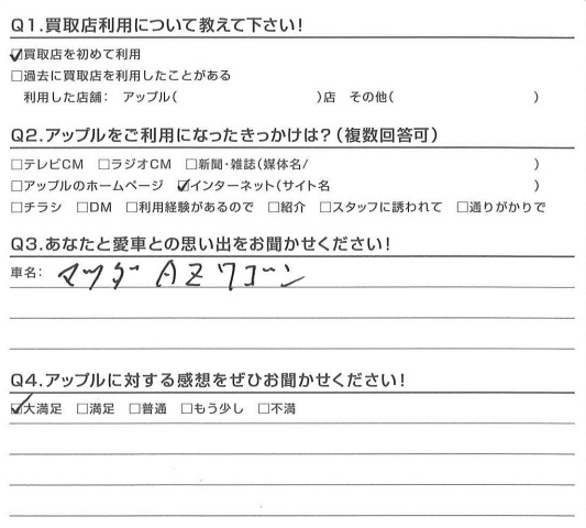 お車のご相談・ 査定だけでもOK! カンタン 入力 30秒 アップルがブランド買取始めました! お電話でも受付中! 受付時間10:00 ~ 18:30 0120-174-177 お車のご相談・ 査定だけでもOK! カンタン 入力 30秒 アップルがブランド買取始めました! お電話でも受付中! 受付時間10:00 ~ 18:30 0120-174-177 アップルがブランド買取始めました! お電話でも受付中! 受付時間10:00 ~ 18:30 0120-174-177 店舗情報 在庫車 スタッフ紹介 ブログ お客様の声 キャンペーン お得 無料査定 click お客様の声 ご記入日: 2016/10/23 N様 愛車:AZワゴン担当:鈴木 前へ 次へ お客様の声一覧を見る