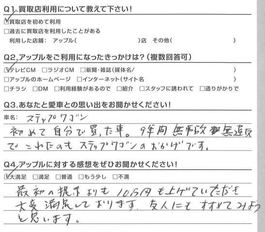 お車のご相談・ 査定だけでもOK! カンタン 入力 30秒 アップルがブランド買取始めました! お電話でも受付中! 受付時間10:00 ~ 18:30 0120-174-177 お車のご相談・ 査定だけでもOK! カンタン 入力 30秒 アップルがブランド買取始めました! お電話でも受付中! 受付時間10:00 ~ 18:30 0120-174-177 アップルがブランド買取始めました! お電話でも受付中! 受付時間10:00 ~ 18:30 0120-174-177 店舗情報 在庫車 スタッフ紹介 ブログ お客様の声 キャンペーン お得 無料査定 click お客様の声 ご記入日: 2016/10/18 J様 最初の提示よりも10万円も上げていただき大変満足しております。友人にもすすめてみようと思います。担当:鈴木 前へ 次へ お客様の声一覧を見る