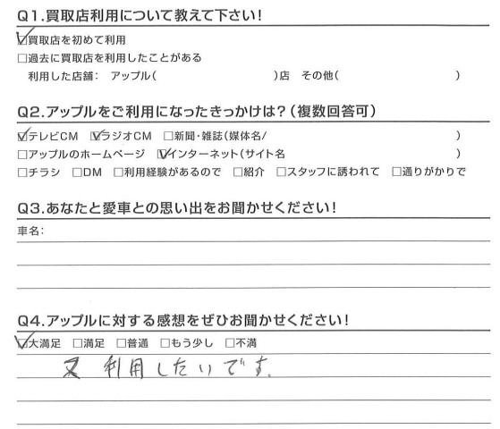 お車のご相談・ 査定だけでもOK! カンタン 入力 30秒 アップルがブランド買取始めました! お電話でも受付中! 受付時間10:00 ~ 18:30 0120-174-177 お車のご相談・ 査定だけでもOK! カンタン 入力 30秒 アップルがブランド買取始めました! お電話でも受付中! 受付時間10:00 ~ 18:30 0120-174-177 アップルがブランド買取始めました! お電話でも受付中! 受付時間10:00 ~ 18:30 0120-174-177 店舗情報 在庫車 スタッフ紹介 ブログ お客様の声 キャンペーン お得 無料査定 click お客様の声 ご記入日: 2017/01/10 H様 また利用したいです。担当:中瀬 前へ 次へ お客様の声一覧を見る