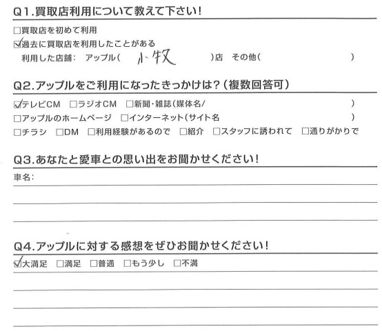 お車のご相談・ 査定だけでもOK! カンタン 入力 30秒 アップルがブランド買取始めました! お電話でも受付中! 受付時間10:00 ~ 18:30 0120-174-177 お車のご相談・ 査定だけでもOK! カンタン 入力 30秒 アップルがブランド買取始めました! お電話でも受付中! 受付時間10:00 ~ 18:30 0120-174-177 アップルがブランド買取始めました! お電話でも受付中! 受付時間10:00 ~ 18:30 0120-174-177 店舗情報 在庫車 スタッフ紹介 ブログ お客様の声 キャンペーン お得 無料査定 click お客様の声 ご記入日: 2017/01/14 A様 担当:野口 前へ 次へ お客様の声一覧を見る