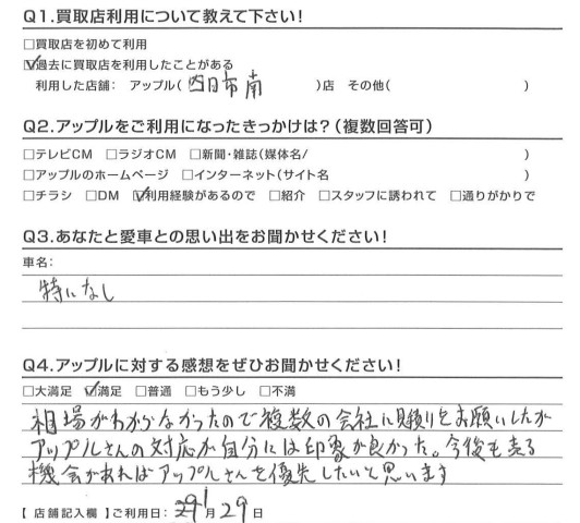 お車のご相談・ 査定だけでもOK! カンタン 入力 30秒 アップルがブランド買取始めました! お電話でも受付中! 受付時間10:00 ~ 18:30 0120-174-177 お車のご相談・ 査定だけでもOK! カンタン 入力 30秒 アップルがブランド買取始めました! お電話でも受付中! 受付時間10:00 ~ 18:30 0120-174-177 アップルがブランド買取始めました! お電話でも受付中! 受付時間10:00 ~ 18:30 0120-174-177 店舗情報 在庫車 スタッフ紹介 ブログ お客様の声 キャンペーン お得 無料査定 click お客様の声 ご記入日: 2017/01/29 A様 相場が分からなかったので複数の会社に見積もりをお願いしたが、アップルさんの対応が自分には印象が良かった。今後も売る機会があれば、アップルさんを優先したいと思います。担当:鈴木 前へ 次へ お客様の声一覧を見る