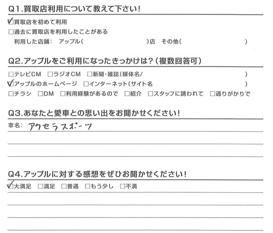 お車のご相談・ 査定だけでもOK! カンタン 入力 30秒 アップルがブランド買取始めました! お電話でも受付中! 受付時間10:00 ~ 18:30 0120-174-177 お車のご相談・ 査定だけでもOK! カンタン 入力 30秒 アップルがブランド買取始めました! お電話でも受付中! 受付時間10:00 ~ 18:30 0120-174-177 アップルがブランド買取始めました! お電話でも受付中! 受付時間10:00 ~ 18:30 0120-174-177 店舗情報 在庫車 スタッフ紹介 ブログ お客様の声 キャンペーン お得 無料査定 click お客様の声 ご記入日: 2017/02/18 S様 愛車:アクセラスポーツ担当:松嶋 前へ 次へ お客様の声一覧を見る