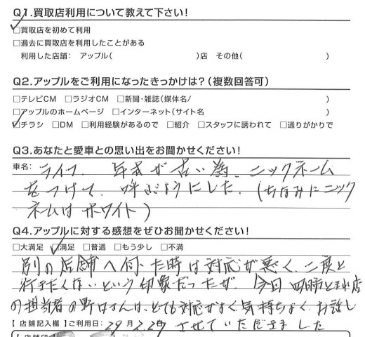 お車のご相談・ 査定だけでもOK! カンタン 入力 30秒 アップルがブランド買取始めました! お電話でも受付中! 受付時間10:00 ~ 18:30 0120-174-177 お車のご相談・ 査定だけでもOK! カンタン 入力 30秒 アップルがブランド買取始めました! お電話でも受付中! 受付時間10:00 ~ 18:30 0120-174-177 アップルがブランド買取始めました! お電話でも受付中! 受付時間10:00 ~ 18:30 0120-174-177 店舗情報 在庫車 スタッフ紹介 ブログ お客様の声 キャンペーン お得 無料査定 click お客様の声 ご記入日: 2017/02/27 K様 別の店舗に伺ったときは対応が悪く、二度と行きたくないという印象だったが、今回、四日市ときわ店の担当者の野口さんは、とても対応が良く気持ちよくお話しさせていただきました。 前へ 次へ お客様の声一覧を見る
