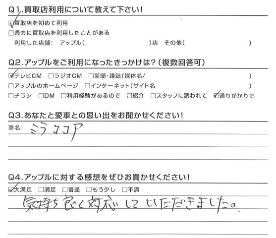 お車のご相談・ 査定だけでもOK! カンタン 入力 30秒 アップルがブランド買取始めました! お電話でも受付中! 受付時間10:00 ~ 18:30 0120-174-177 お車のご相談・ 査定だけでもOK! カンタン 入力 30秒 アップルがブランド買取始めました! お電話でも受付中! 受付時間10:00 ~ 18:30 0120-174-177 アップルがブランド買取始めました! お電話でも受付中! 受付時間10:00 ~ 18:30 0120-174-177 店舗情報 在庫車 スタッフ紹介 ブログ お客様の声 キャンペーン お得 無料査定 click お客様の声 ご記入日: 2017/03/02 Y様 愛車:ミラココア 気持ち良く対応していただきました。担当:鈴木 前へ 次へ お客様の声一覧を見る