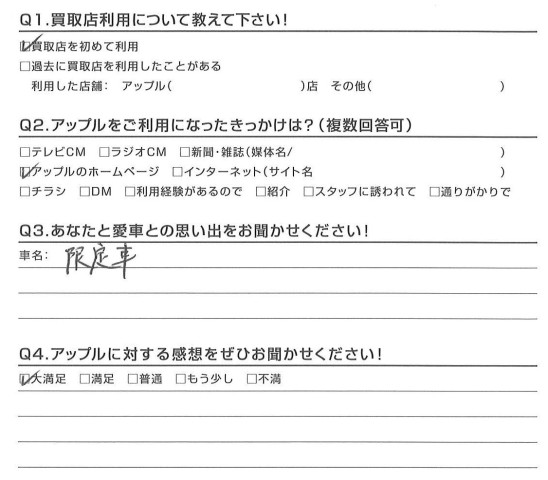 お車のご相談・ 査定だけでもOK! カンタン 入力 30秒 アップルがブランド買取始めました! お電話でも受付中! 受付時間10:00 ~ 18:30 0120-174-177 お車のご相談・ 査定だけでもOK! カンタン 入力 30秒 アップルがブランド買取始めました! お電話でも受付中! 受付時間10:00 ~ 18:30 0120-174-177 アップルがブランド買取始めました! お電話でも受付中! 受付時間10:00 ~ 18:30 0120-174-177 店舗情報 在庫車 スタッフ紹介 ブログ お客様の声 キャンペーン お得 無料査定 click お客様の声 ご記入日: 2017/03/05 I様 愛車:レガシィ(限定車)アップル四日市ときわ店の担当者とは非常にスムーズで良い取引が出来ました。若い方でしたがマニアックな車に対する知識もあり感心しました。(メールにてコメント頂きました)担当:鈴木 前へ 次へ お客様の声一覧を見る