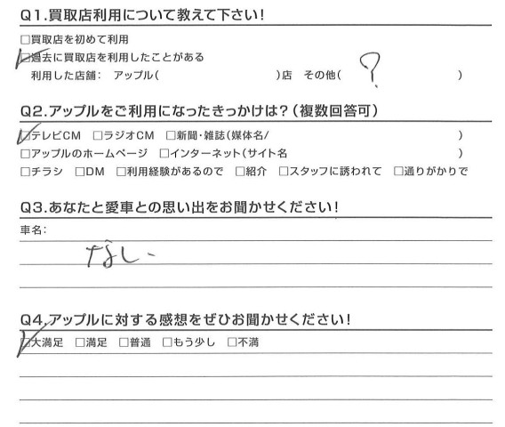 お車のご相談・ 査定だけでもOK! カンタン 入力 30秒 アップルがブランド買取始めました! お電話でも受付中! 受付時間10:00 ~ 18:30 0120-174-177 お車のご相談・ 査定だけでもOK! カンタン 入力 30秒 アップルがブランド買取始めました! お電話でも受付中! 受付時間10:00 ~ 18:30 0120-174-177 アップルがブランド買取始めました! お電話でも受付中! 受付時間10:00 ~ 18:30 0120-174-177 店舗情報 在庫車 スタッフ紹介 ブログ お客様の声 キャンペーン お得 無料査定 click お客様の声 ご記入日: 2017/03/12 M様 愛車:ノア担当:中瀬 前へ 次へ お客様の声一覧を見る