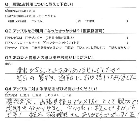 お車のご相談・ 査定だけでもOK! カンタン 入力 30秒 アップルがブランド買取始めました! お電話でも受付中! 受付時間10:00 ~ 18:30 0120-174-177 お車のご相談・ 査定だけでもOK! カンタン 入力 30秒 アップルがブランド買取始めました! お電話でも受付中! 受付時間10:00 ~ 18:30 0120-174-177 アップルがブランド買取始めました! お電話でも受付中! 受付時間10:00 ~ 18:30 0120-174-177 店舗情報 在庫車 スタッフ紹介 ブログ お客様の声 キャンペーン お得 無料査定 click お客様の声 ご記入日: 2017/03/29 T様 電話対応、出張見積もりでの対応とても親切で、説明もわかりやすくアップルに頼んでよかったです!鈴木裕理亜さんありがとうございました!担当:鈴木 前へ 次へ お客様の声一覧を見る
