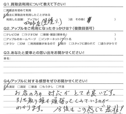 お車のご相談・ 査定だけでもOK! カンタン 入力 30秒 アップルがブランド買取始めました! お電話でも受付中! 受付時間10:00 ~ 18:30 0120-174-177 お車のご相談・ 査定だけでもOK! カンタン 入力 30秒 アップルがブランド買取始めました! お電話でも受付中! 受付時間10:00 ~ 18:30 0120-174-177 アップルがブランド買取始めました! お電話でも受付中! 受付時間10:00 ~ 18:30 0120-174-177 店舗情報 在庫車 スタッフ紹介 ブログ お客様の声 キャンペーン お得 無料査定 click お客様の声 ご記入日: 2017/05/28 M様 お店の方の対応がとても良いです。引き取り額も頑張ってくれているのがわかります。今後もこの感じで是非!担当:松嶋 前へ 次へ お客様の声一覧を見る