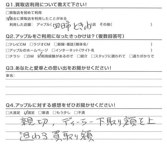 お車のご相談・ 査定だけでもOK! カンタン 入力 30秒 アップルがブランド買取始めました! お電話でも受付中! 受付時間10:00 ~ 18:30 0120-174-177 お車のご相談・ 査定だけでもOK! カンタン 入力 30秒 アップルがブランド買取始めました! お電話でも受付中! 受付時間10:00 ~ 18:30 0120-174-177 アップルがブランド買取始めました! お電話でも受付中! 受付時間10:00 ~ 18:30 0120-174-177 店舗情報 在庫車 スタッフ紹介 ブログ お客様の声 キャンペーン お得 無料査定 click お客様の声 ご記入日: 2017/05/21 I様 親切、ディーラー下取り額を上回る、買取額 前へ 次へ お客様の声一覧を見る
