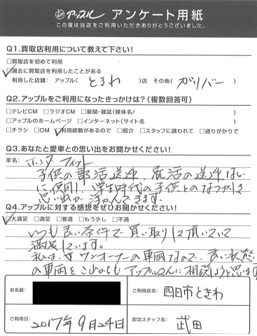 お車のご相談・ 査定だけでもOK! カンタン 入力 30秒 アップルがブランド買取始めました! お電話でも受付中! 受付時間10:00 ~ 18:30 0120-174-177 お車のご相談・ 査定だけでもOK! カンタン 入力 30秒 アップルがブランド買取始めました! お電話でも受付中! 受付時間10:00 ~ 18:30 0120-174-177 アップルがブランド買取始めました! お電話でも受付中! 受付時間10:00 ~ 18:30 0120-174-177 店舗情報 在庫車 スタッフ紹介 ブログ お客様の声 キャンペーン お得 無料査定 click お客様の声 ご記入日: 2017/09/24 I様 愛車:ホンダ フィット子供の部活送迎、就活の送迎などに使用し、学生時代の子供とのなつかしき思い出が浮かんできます。いつも良い条件で買い取りして頂いていて満足しています。私は、ワンオーナーの車両なので、良い状態の車両をこれからもアップルさんに相談しようと思います。 前へ 次へ お客様の声一覧を見る