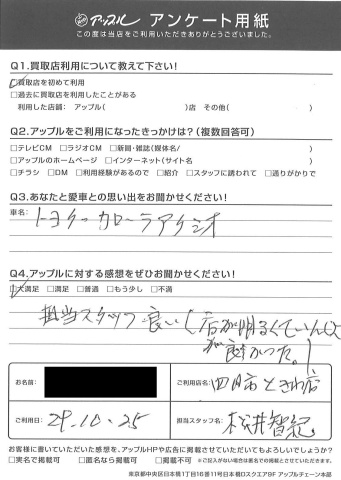 お車のご相談・ 査定だけでもOK! カンタン 入力 30秒 アップルがブランド買取始めました! お電話でも受付中! 受付時間10:00 ~ 18:30 0120-174-177 お車のご相談・ 査定だけでもOK! カンタン 入力 30秒 アップルがブランド買取始めました! お電話でも受付中! 受付時間10:00 ~ 18:30 0120-174-177 アップルがブランド買取始めました! お電話でも受付中! 受付時間10:00 ~ 18:30 0120-174-177 店舗情報 在庫車 スタッフ紹介 ブログ お客様の声 キャンペーン お得 無料査定 click お客様の声 ご記入日: 2017/10/25 M様 トヨタ・カローラアクシオ担当スタッフ良い(店が明るくていんしょが良かった。) 前へ 次へ お客様の声一覧を見る