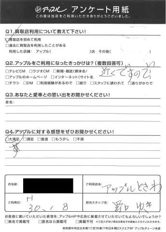 お車のご相談・ 査定だけでもOK! カンタン 入力 30秒 アップルがブランド買取始めました! お電話でも受付中! 受付時間10:00 ~ 18:30 0120-174-177 お車のご相談・ 査定だけでもOK! カンタン 入力 30秒 アップルがブランド買取始めました! お電話でも受付中! 受付時間10:00 ~ 18:30 0120-174-177 アップルがブランド買取始めました! お電話でも受付中! 受付時間10:00 ~ 18:30 0120-174-177 店舗情報 在庫車 スタッフ紹介 ブログ お客様の声 キャンペーン お得 無料査定 click お客様の声 ご記入日: 2018/01/08 M様 担当:野口 前へ 次へ お客様の声一覧を見る