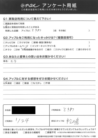 お車のご相談・ 査定だけでもOK! カンタン 入力 30秒 アップルがブランド買取始めました! お電話でも受付中! 受付時間10:00 ~ 18:30 0120-174-177 お車のご相談・ 査定だけでもOK! カンタン 入力 30秒 アップルがブランド買取始めました! お電話でも受付中! 受付時間10:00 ~ 18:30 0120-174-177 アップルがブランド買取始めました! お電話でも受付中! 受付時間10:00 ~ 18:30 0120-174-177 店舗情報 在庫車 スタッフ紹介 ブログ お客様の声 キャンペーン お得 無料査定 click お客様の声 ご記入日: 2018/01/24 S様 ミラ 前へ 次へ お客様の声一覧を見る