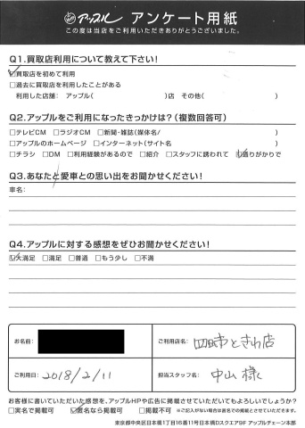お車のご相談・ 査定だけでもOK! カンタン 入力 30秒 アップルがブランド買取始めました! お電話でも受付中! 受付時間10:00 ~ 18:30 0120-174-177 お車のご相談・ 査定だけでもOK! カンタン 入力 30秒 アップルがブランド買取始めました! お電話でも受付中! 受付時間10:00 ~ 18:30 0120-174-177 アップルがブランド買取始めました! お電話でも受付中! 受付時間10:00 ~ 18:30 0120-174-177 店舗情報 在庫車 スタッフ紹介 ブログ お客様の声 キャンペーン お得 無料査定 click お客様の声 ご記入日: 2018/02/11 H様 担当:中山 前へ 次へ お客様の声一覧を見る