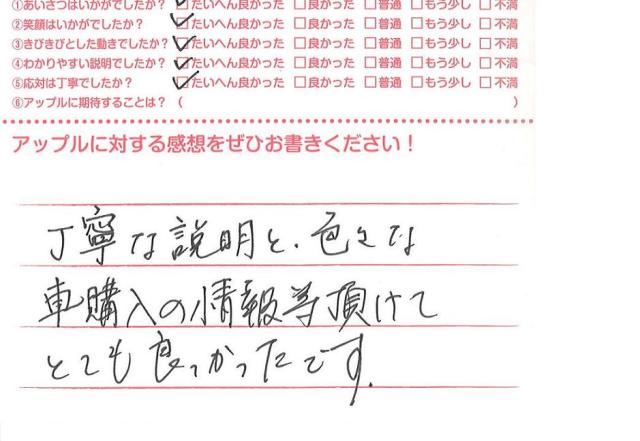 お車のご相談・ 査定だけでもOK! カンタン 入力 30秒 アップルがブランド買取始めました! お電話でも受付中! 受付時間10:00 ~ 18:30 0120-174-177 お車のご相談・ 査定だけでもOK! カンタン 入力 30秒 アップルがブランド買取始めました! お電話でも受付中! 受付時間10:00 ~ 18:30 0120-174-177 アップルがブランド買取始めました! お電話でも受付中! 受付時間10:00 ~ 18:30 0120-174-177 店舗情報 在庫車 スタッフ紹介 ブログ お客様の声 キャンペーン お得 無料査定 click お客様の声 ご記入日: 2012/09/01 水橋様 丁寧な説明と、色々な車購入の情報等頂けてとても良かったです。*担当 松井 前へ 次へ お客様の声一覧を見る