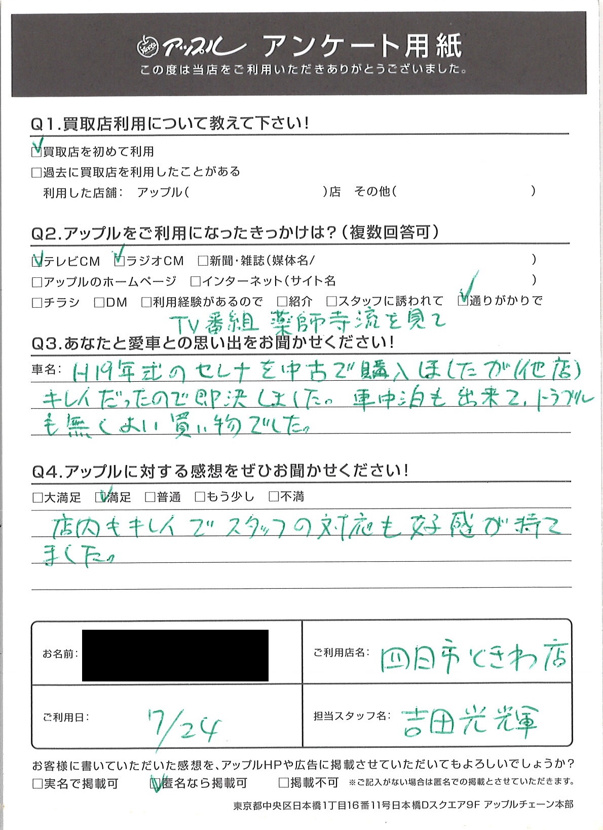 お車のご相談・ 査定だけでもOK! カンタン 入力 30秒 アップルがブランド買取始めました! お電話でも受付中! 受付時間10:00 ~ 18:30 0120-174-177 お車のご相談・ 査定だけでもOK! カンタン 入力 30秒 アップルがブランド買取始めました! お電話でも受付中! 受付時間10:00 ~ 18:30 0120-174-177 アップルがブランド買取始めました! お電話でも受付中! 受付時間10:00 ~ 18:30 0120-174-177 店舗情報 在庫車 スタッフ紹介 ブログ お客様の声 キャンペーン お得 無料査定 click お客様の声 ご記入日: 2018/07/24 S様 車名:日産 セレナ 店内もキレイでスタッフの対応も好感が持てました。 前へ 次へ お客様の声一覧を見る