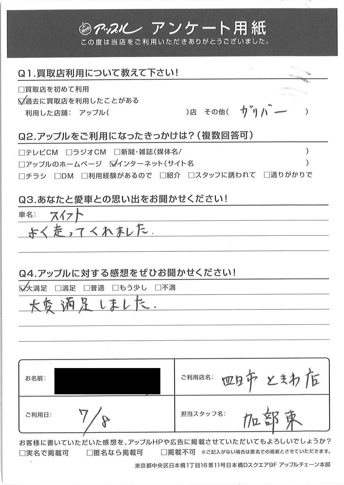 お車のご相談・ 査定だけでもOK! カンタン 入力 30秒 アップルがブランド買取始めました! お電話でも受付中! 受付時間10:00 ~ 18:30 0120-174-177 お車のご相談・ 査定だけでもOK! カンタン 入力 30秒 アップルがブランド買取始めました! お電話でも受付中! 受付時間10:00 ~ 18:30 0120-174-177 アップルがブランド買取始めました! お電話でも受付中! 受付時間10:00 ~ 18:30 0120-174-177 店舗情報 在庫車 スタッフ紹介 ブログ お客様の声 キャンペーン お得 無料査定 click お客様の声 ご記入日: 2018/07/08 S様 車名:スズキ スイフト 大変満足しました。 前へ 次へ お客様の声一覧を見る