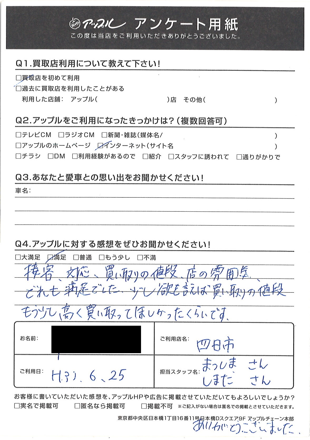 お車のご相談・ 査定だけでもOK! カンタン 入力 30秒 アップルがブランド買取始めました! お電話でも受付中! 受付時間10:00 ~ 18:30 0120-174-177 お車のご相談・ 査定だけでもOK! カンタン 入力 30秒 アップルがブランド買取始めました! お電話でも受付中! 受付時間10:00 ~ 18:30 0120-174-177 アップルがブランド買取始めました! お電話でも受付中! 受付時間10:00 ~ 18:30 0120-174-177 店舗情報 在庫車 スタッフ紹介 ブログ お客様の声 キャンペーン お得 無料査定 click お客様の声 ご記入日: 2018/06/25 M様 接客、対応、買い取りの値段、店の雰囲気どれも満足でした。少し欲を言えば買い取りの値段もう少し高く買い取ってほしかったくらいです。 前へ 次へ お客様の声一覧を見る