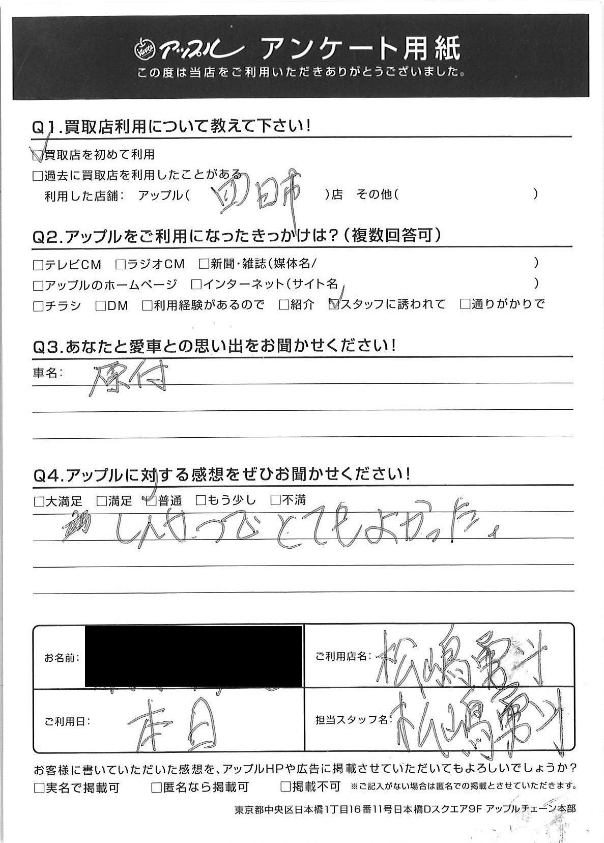 お車のご相談・ 査定だけでもOK! カンタン 入力 30秒 アップルがブランド買取始めました! お電話でも受付中! 受付時間10:00 ~ 18:30 0120-174-177 お車のご相談・ 査定だけでもOK! カンタン 入力 30秒 アップルがブランド買取始めました! お電話でも受付中! 受付時間10:00 ~ 18:30 0120-174-177 アップルがブランド買取始めました! お電話でも受付中! 受付時間10:00 ~ 18:30 0120-174-177 店舗情報 在庫車 スタッフ紹介 ブログ お客様の声 キャンペーン お得 無料査定 click お客様の声 ご記入日: 2018/05/23 H様 しんせつでとてもよかった。 前へ 次へ お客様の声一覧を見る