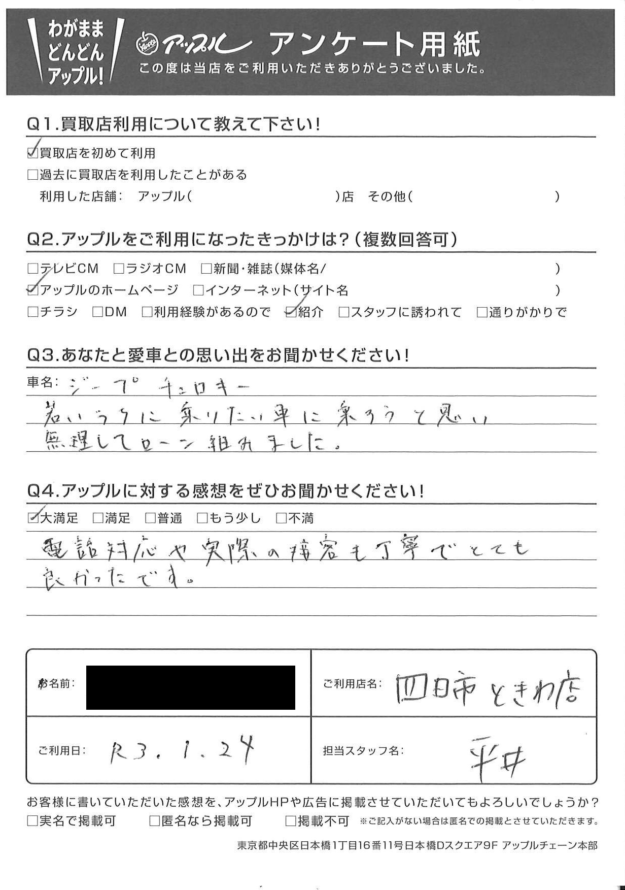 お車のご相談・ 査定だけでもOK! カンタン 入力 30秒 アップルがブランド買取始めました! お電話でも受付中! 受付時間10:00 ~ 18:30 0120-174-177 お車のご相談・ 査定だけでもOK! カンタン 入力 30秒 アップルがブランド買取始めました! お電話でも受付中! 受付時間10:00 ~ 18:30 0120-174-177 アップルがブランド買取始めました! お電話でも受付中! 受付時間10:00 ~ 18:30 0120-174-177 店舗情報 在庫車 スタッフ紹介 ブログ お客様の声 キャンペーン お得 無料査定 click お客様の声 ご記入日: 2021/01/24 I様 車名:ジープ チェロキー 電話対応や実際の接客も丁寧でとても良かったです。 前へ 次へ お客様の声一覧を見る