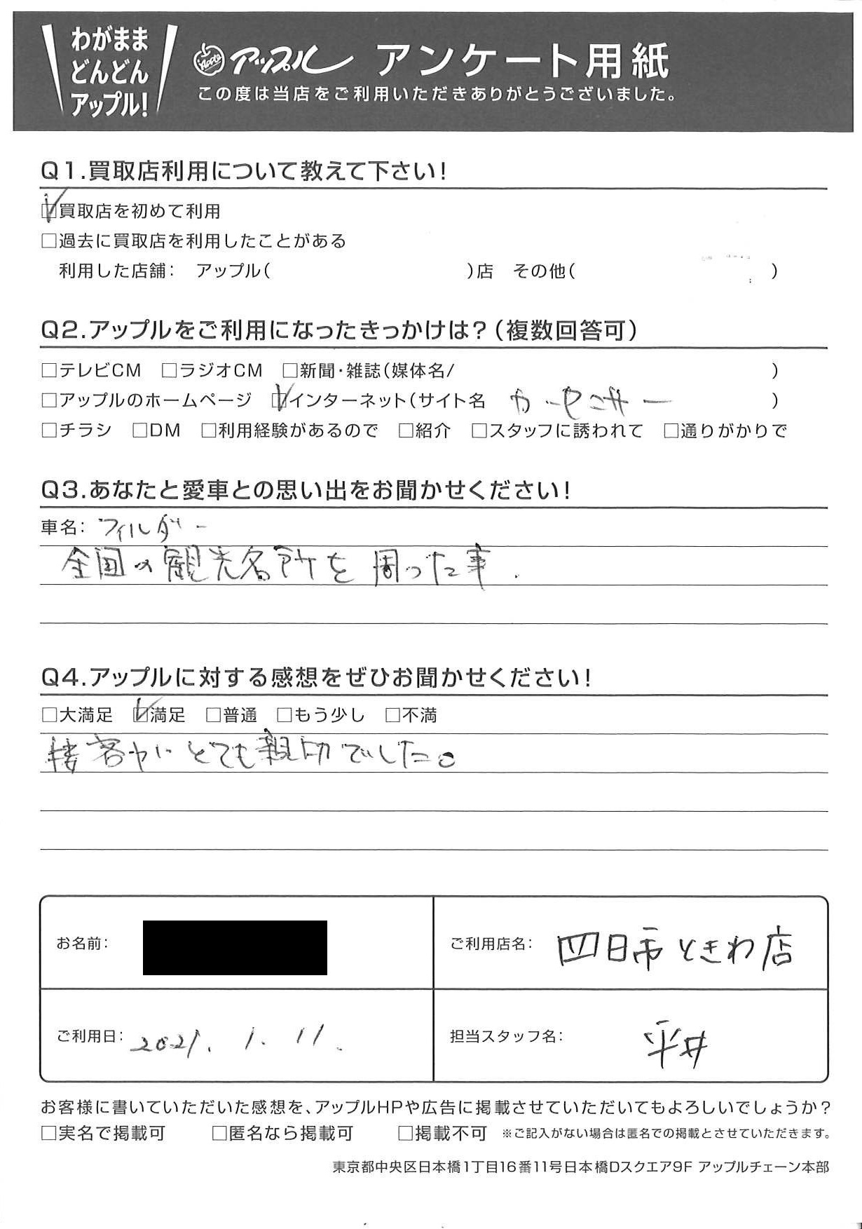 お車のご相談・ 査定だけでもOK! カンタン 入力 30秒 アップルがブランド買取始めました! お電話でも受付中! 受付時間10:00 ~ 18:30 0120-174-177 お車のご相談・ 査定だけでもOK! カンタン 入力 30秒 アップルがブランド買取始めました! お電話でも受付中! 受付時間10:00 ~ 18:30 0120-174-177 アップルがブランド買取始めました! お電話でも受付中! 受付時間10:00 ~ 18:30 0120-174-177 店舗情報 在庫車 スタッフ紹介 ブログ お客様の声 キャンペーン お得 無料査定 click お客様の声 ご記入日: 2021/01/11 D様 車名:トヨタ カローラフィールダー フィールダー(カローラ) 接客がとても親切でした。 前へ 次へ お客様の声一覧を見る