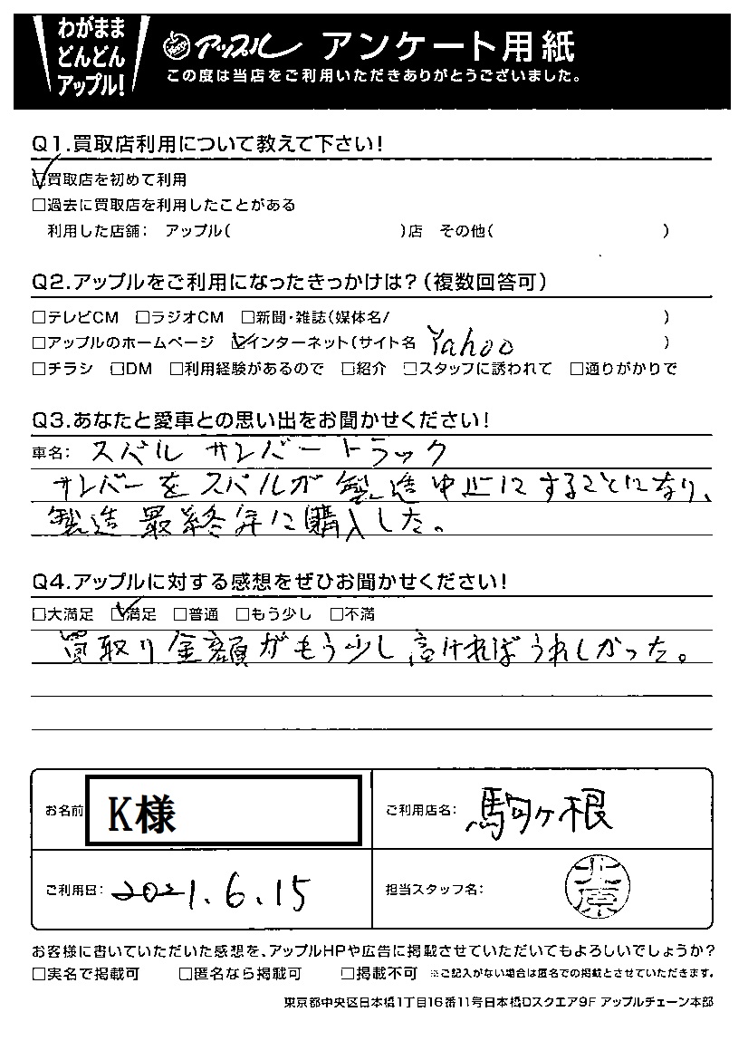 K様 車名:スバル サンバートラック