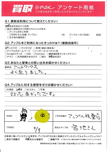 お車のご相談・ 査定だけでもOK! カンタン 入力 30秒 アップルがブランド買取始めました! お電話でも受付中! 受付時間10:00 ~ 19:00 0120-43-2228 お車のご相談・ 査定だけでもOK! カンタン 入力 30秒 アップルがブランド買取始めました! お電話でも受付中! 受付時間10:00 ~ 19:00 0120-43-2228 アップルがブランド買取始めました! お電話でも受付中! 受付時間10:00 ~ 19:00 0120-43-2228 店舗情報 在庫車 スタッフ紹介 ブログ お客様の声 キャンペーン 無料査定 click お客様の声 ご記入日: 2023/07/09 T.O様 車名:スズキ アルト (2015年12月以降のワークス含む) (愛車との思い出)アルトワークス、よく走りました。(アップルに対するご感想)対応良かったです。 前へ 次へ お客様の声一覧を見る