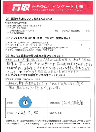 初めて車を売却しました。他のどの店よりも高く買い取っていただきよかったです。