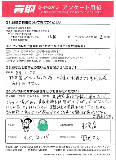 元所有者は高齢で車のあちらこちらに傷があり、買取金額も値段がつけばいいかなくらいにしか思っていなかったのに予想以上の金額をつけて下さったのと色々な所に気づかいが感じられてこちらにお願いして良かったなと大満足でした。