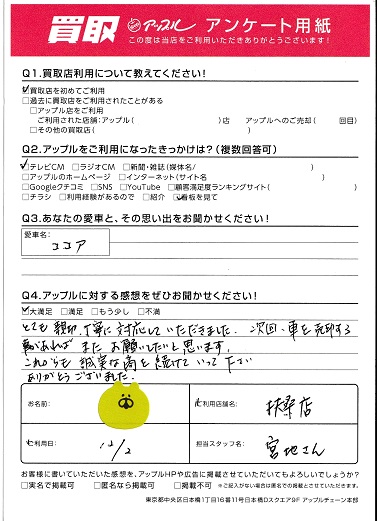 とても親切、丁寧に対応していただきました。次回 車を売却する事があれば またお願いしたいと思います。これからも誠実な商を続けていって下さい。