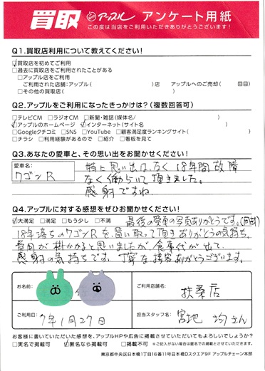 最後の愛車の写真ありがとうです。18年落ちのワゴンRを買い取って頂きありがとうの気持ち、費用が掛かると思いましたが食事代が出て感謝の気持ちです、丁寧な接客ありがとうございます。