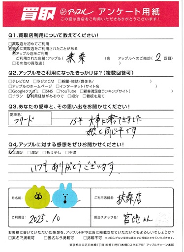お車のご相談・ 査定だけでもOK! カンタン 入力 30秒 アップルがブランド買取始めました! お電話でも受付中! 受付時間10:00 ~ 19:00 0120-43-2228 お車のご相談・ 査定だけでもOK! カンタン 入力 30秒 アップルがブランド買取始めました! お電話でも受付中! 受付時間10:00 ~ 19:00 0120-43-2228 アップルがブランド買取始めました! お電話でも受付中! 受付時間10:00 ~ 19:00 0120-43-2228 店舗情報 在庫車 スタッフ紹介 ブログ お客様の声 キャンペーン お得 無料査定 click お客様の声 ご記入日: 2025/10/26 M.N様 車名:ホンダ フリードハイブリッド(~H28年8月) (愛車との思い出)15年大事に乗ってきました、娘と同じ年です。(アップルに対するご感想)いつもありがとうございます。 前へ 次へ お客様の声一覧を見る