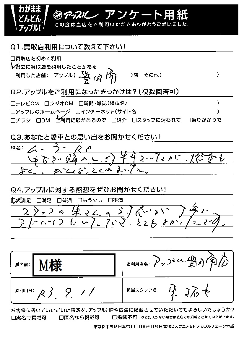 お車のご相談・ 査定だけでもOK! カンタン 入力 30秒 アップルがブランド買取始めました! お電話でも受付中! 受付時間09:30 ~ 18:00 0565-53-8800 お車のご相談・ 査定だけでもOK! カンタン 入力 30秒 アップルがブランド買取始めました! お電話でも受付中! 受付時間09:30 ~ 18:00 0565-53-8800 アップルがブランド買取始めました! お電話でも受付中! 受付時間09:30 ~ 18:00 0565-53-8800 店舗情報 在庫車 スタッフ紹介 ブログ お客様の声 キャンペーン お得 無料査定 click お客様の声 ご記入日: 2021/09/11 匿名様 車名:ダイハツ ムーヴ スタッフの東さん対応が丁寧でアドバイスもいただきとてもよかったです。 前へ 次へ お客様の声一覧を見る