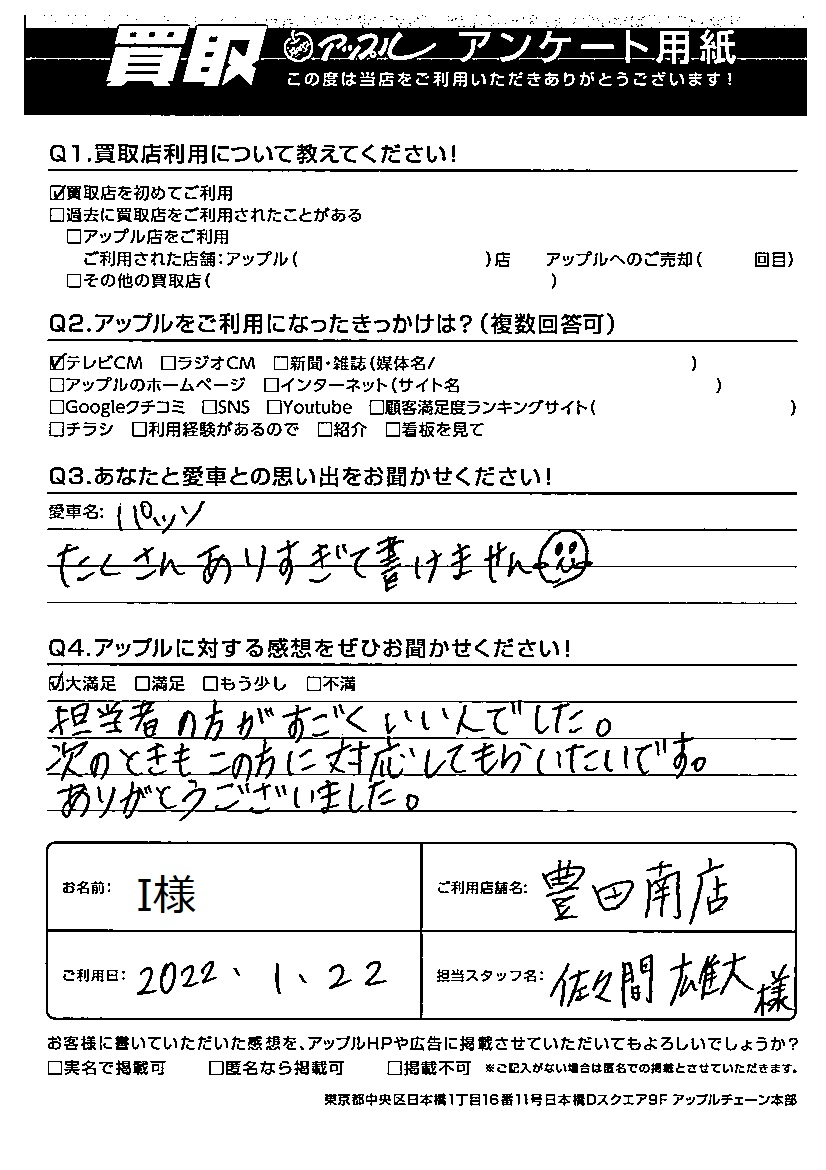 お車のご相談・ 査定だけでもOK! カンタン 入力 30秒 アップルがブランド買取始めました! お電話でも受付中! 受付時間09:30 ~ 18:00 0565-53-8800 お車のご相談・ 査定だけでもOK! カンタン 入力 30秒 アップルがブランド買取始めました! お電話でも受付中! 受付時間09:30 ~ 18:00 0565-53-8800 アップルがブランド買取始めました! お電話でも受付中! 受付時間09:30 ~ 18:00 0565-53-8800 店舗情報 在庫車 スタッフ紹介 ブログ お客様の声 キャンペーン お得 無料査定 click お客様の声 ご記入日: 2022/01/22 I様 車名:トヨタ パッソ Q あなたと愛車との思い出をお聞かせください!たくさんありすぎて書けませんQ アップルに対する感想をぜひお聞かせください!感想:大満足担当者の方がすごくいい人でした。次のときもこの方に対応してもらいたいです。ありがとうございました。 前へ 次へ お客様の声一覧を見る