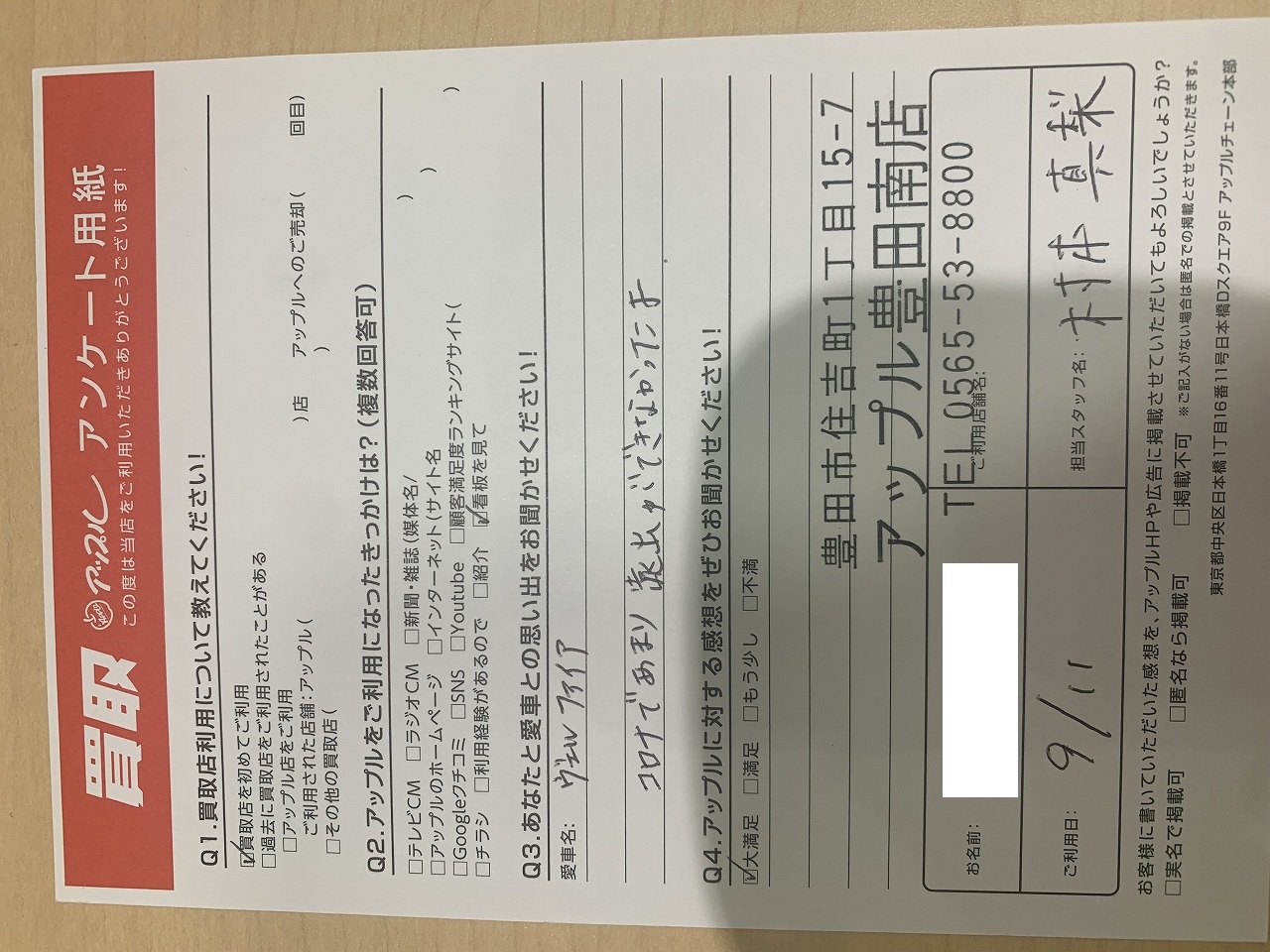 お車のご相談・ 査定だけでもOK! カンタン 入力 30秒 アップルがブランド買取始めました! お電話でも受付中! 受付時間09:30 ~ 18:00 0565-53-8800 お車のご相談・ 査定だけでもOK! カンタン 入力 30秒 アップルがブランド買取始めました! お電話でも受付中! 受付時間09:30 ~ 18:00 0565-53-8800 アップルがブランド買取始めました! お電話でも受付中! 受付時間09:30 ~ 18:00 0565-53-8800 店舗情報 在庫車 スタッフ紹介 ブログ お客様の声 キャンペーン お得 無料査定 click お客様の声 ご記入日: 2022/09/11 匿名様 車名:トヨタ ヴェルファイア(H27年1月~のHYBRID含む) 前へ 次へ お客様の声一覧を見る