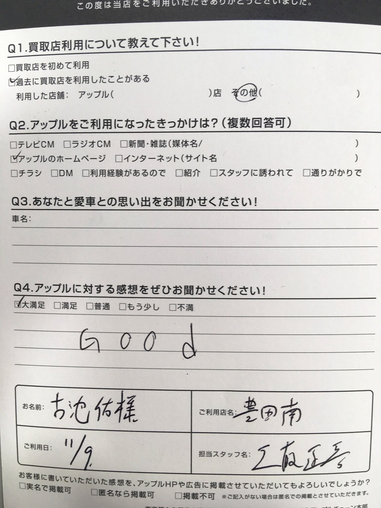 お車のご相談・ 査定だけでもOK! カンタン 入力 30秒 アップルがブランド買取始めました! お電話でも受付中! 受付時間09:30 ~ 18:00 0565-53-8800 お車のご相談・ 査定だけでもOK! カンタン 入力 30秒 アップルがブランド買取始めました! お電話でも受付中! 受付時間09:30 ~ 18:00 0565-53-8800 アップルがブランド買取始めました! お電話でも受付中! 受付時間09:30 ~ 18:00 0565-53-8800 店舗情報 在庫車 スタッフ紹介 ブログ お客様の声 キャンペーン お得 無料査定 click お客様の声 ご記入日: 2019/11/09 愛知県豊田市大林町 F様 車名:フォルクスワーゲン ゴルフ GOOD 前へ 次へ お客様の声一覧を見る