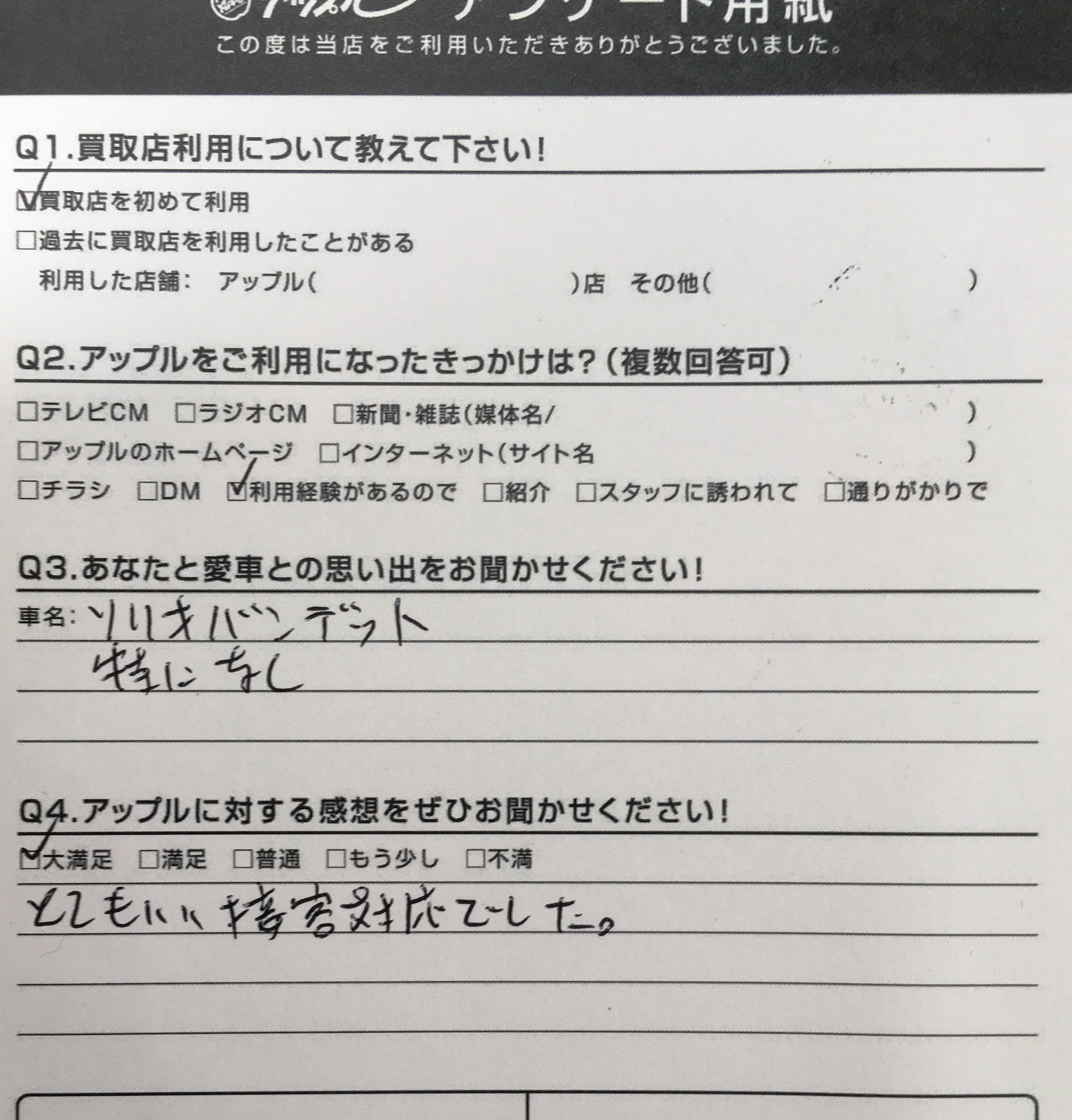 お車のご相談・ 査定だけでもOK! カンタン 入力 30秒 アップルがブランド買取始めました! お電話でも受付中! 受付時間09:30 ~ 18:00 0565-53-8800 お車のご相談・ 査定だけでもOK! カンタン 入力 30秒 アップルがブランド買取始めました! お電話でも受付中! 受付時間09:30 ~ 18:00 0565-53-8800 アップルがブランド買取始めました! お電話でも受付中! 受付時間09:30 ~ 18:00 0565-53-8800 店舗情報 在庫車 スタッフ紹介 ブログ お客様の声 キャンペーン お得 無料査定 click お客様の声 ご記入日: 2020/01/22 愛知県名古屋市 Y様 車名:スズキ ソリオ とてもいい接客でした。 前へ 次へ お客様の声一覧を見る