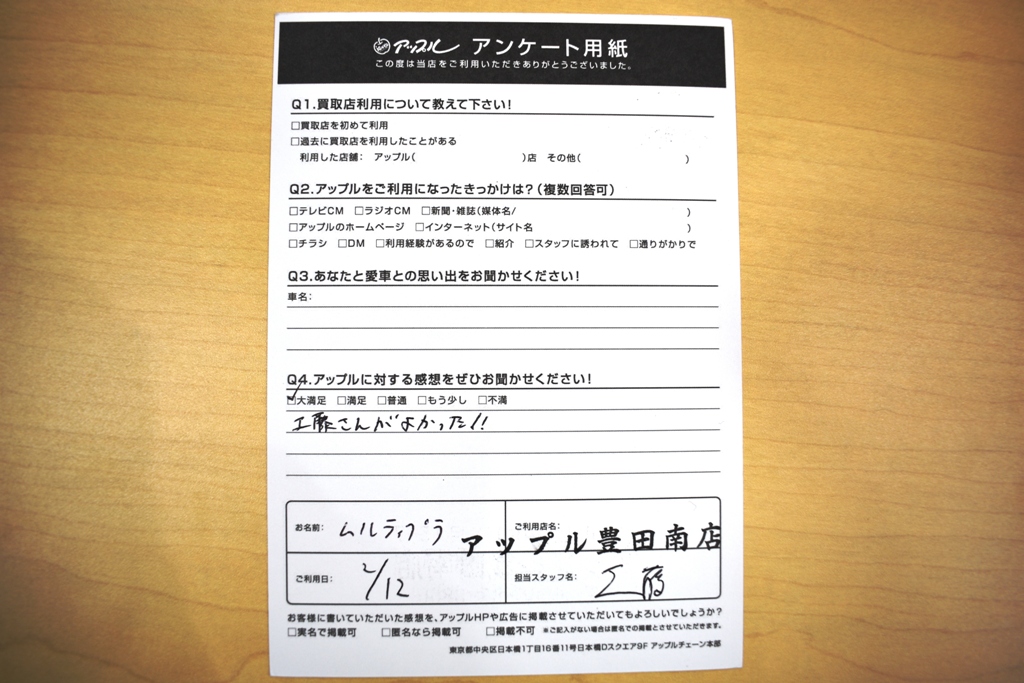 お車のご相談・ 査定だけでもOK! カンタン 入力 30秒 アップルがブランド買取始めました! お電話でも受付中! 受付時間09:30 ~ 18:00 0565-53-8800 お車のご相談・ 査定だけでもOK! カンタン 入力 30秒 アップルがブランド買取始めました! お電話でも受付中! 受付時間09:30 ~ 18:00 0565-53-8800 アップルがブランド買取始めました! お電話でも受付中! 受付時間09:30 ~ 18:00 0565-53-8800 店舗情報 在庫車 スタッフ紹介 ブログ お客様の声 キャンペーン お得 無料査定 click お客様の声 ご記入日: 2020/02/12 愛知県豊田市 匿名様 車名:フィアット ムルティプラ 工藤さんがよかった!! 前へ 次へ お客様の声一覧を見る