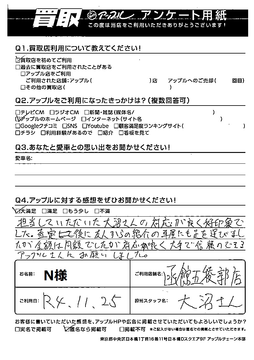 担当していただいた大沼さんの対応が良く好印象でした。査定後に友人からの紹介の車屋にも足を運びましたが金額は同額でしたが、対応が良く大手で信頼のできるアップルさんにお願いしました。
