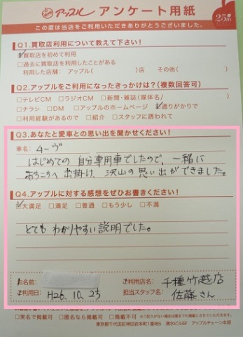 お車のご相談・ 査定だけでもOK! カンタン 入力 30秒 アップルがブランド買取始めました! お電話でも受付中! 受付時間9:30~18:30 052-711-8400 お車のご相談・ 査定だけでもOK! カンタン 入力 30秒 アップルがブランド買取始めました! お電話でも受付中! 受付時間9:30~18:30 052-711-8400 アップルがブランド買取始めました! お電話でも受付中! 受付時間9:30~18:30 052-711-8400 店舗情報 在庫車 スタッフ紹介 ブログ お客様の声 キャンペーン 無料査定 click お客様の声 ご記入日: 2014/10/25 Y・M様 ■ご利用日時■ H26年10月25日■車種■ ムーヴ■担当者■ 佐藤【アップルに対する感想をぜひお書きください】満足度★★★★★とてもわかりやすい説明でした。 前へ 次へ お客様の声一覧を見る